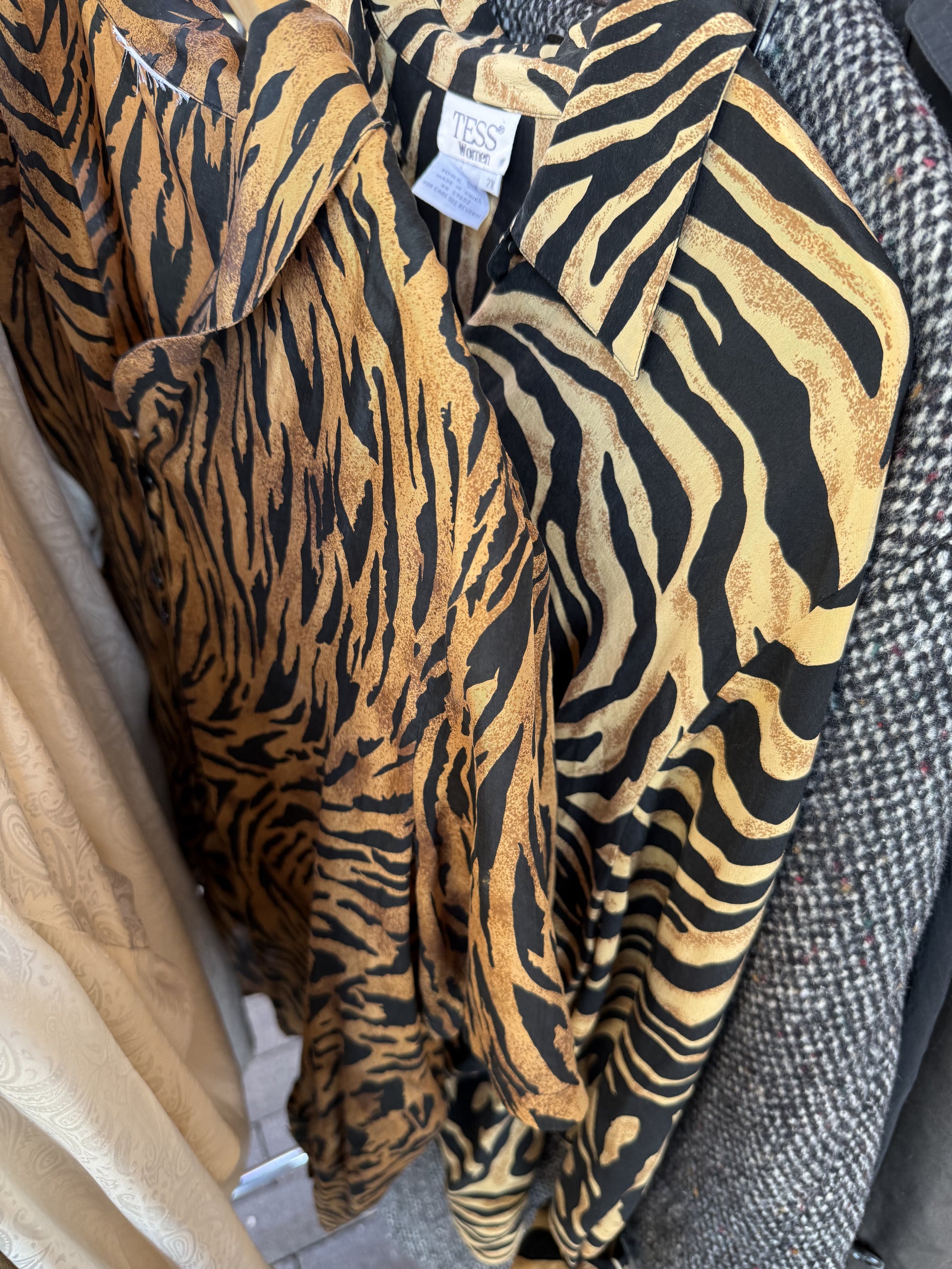 Silk,foft, breezy beautiful and timeless. Cheetah print Large front pockets and back vent for movement.
